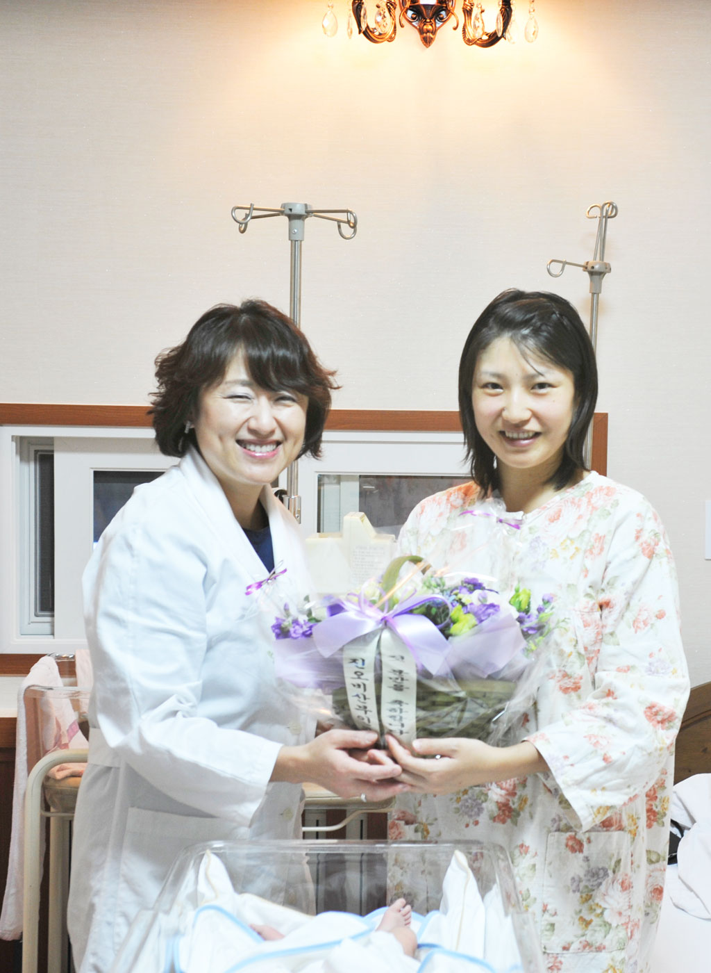 사진은 출산을 축하하기 위하여 병원 직원을 대표하여 최안나 원장님께서 아기를 사이에 두고 산모께 축하 꽃다발을 전달하는 모습. 글쓴이: 배유진 시간: 2012-11-08 11:16
