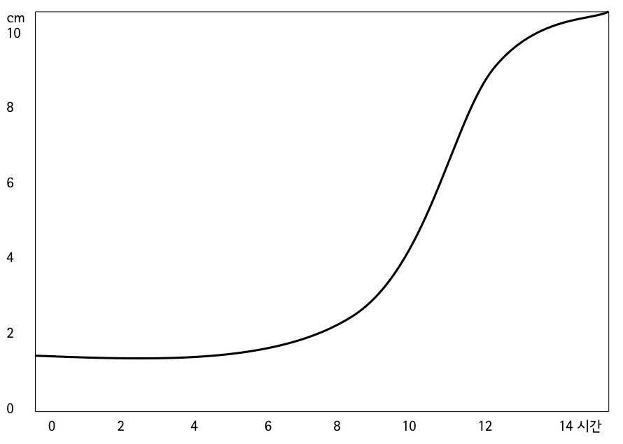 가로축은 진통 경과 시간이고 세로축은 자궁 입구인 경부가 벌어진 정도를 나타내며 다 벌어진 상태는 10cm로 표시합니다. 자궁이 벌어진 정도와 출산 시점에 따라 잠복기, 개구기, 만출기, 후산기로 나누어집니다. 그리고 진통에 걸리는 평균 소요 시간은 다음 표와 같습니다.
