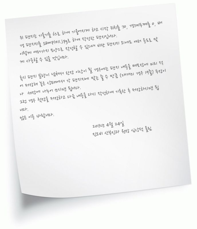 위의 첫번째 편지는 기울기를 6으로 하여 기울어지게 하고 시작 위치를 70, 경계선 두께를 0, 배경 편지지를 sample11.jpg로 하여 작성한 편지입니다.