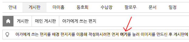 편지 이미지 만들기는 위의 이미지에서 보는 것처럼 "아가에게 쓰는 편지" 게시판의 상단에 있는 "여기" 를 클릭하여 나오는 화면에서 내용을 입력하시면 됩니다.