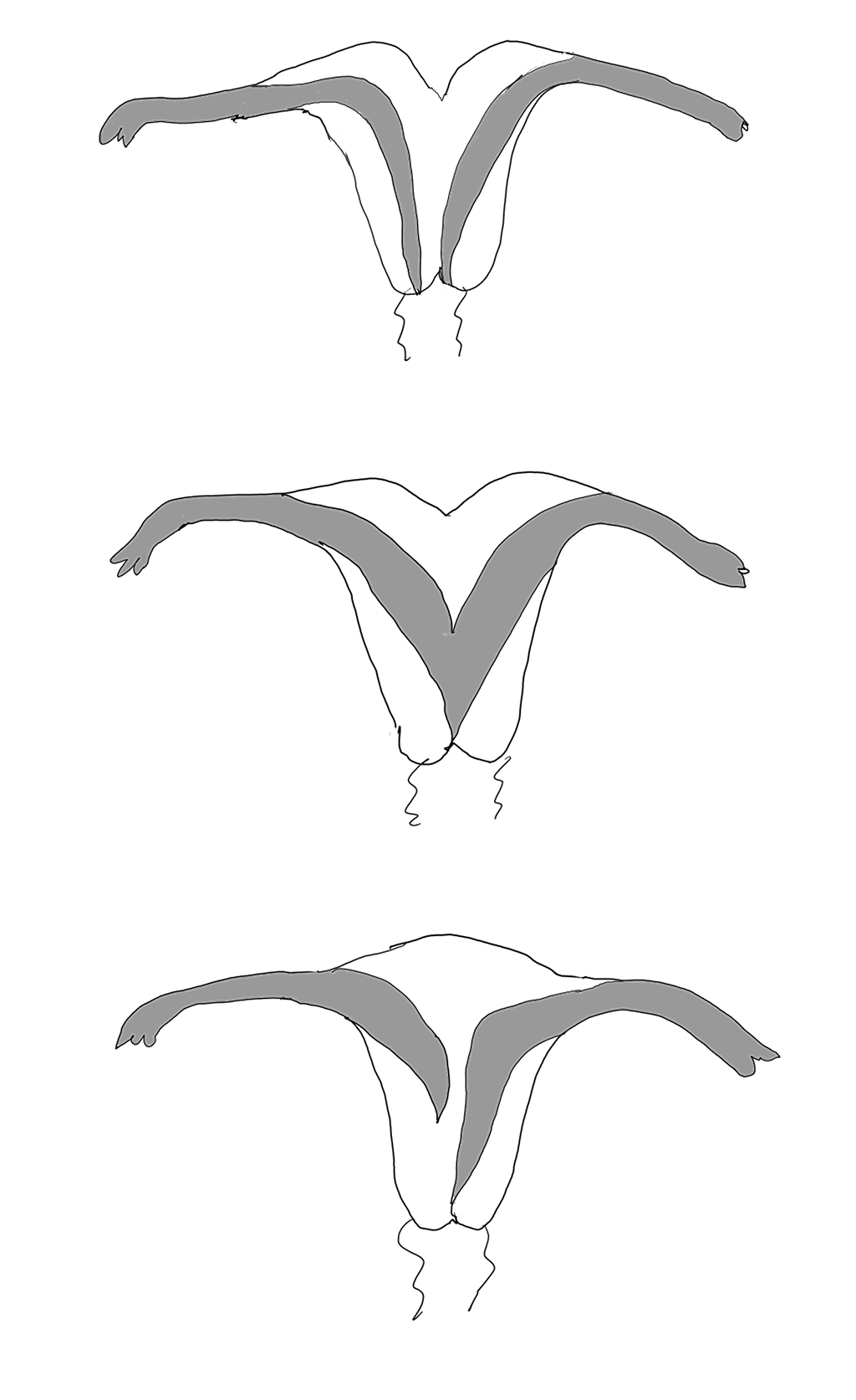 아래 그림은 순서대로 중복 자궁, 쌍각 자궁, 중격 자궁이며 그림에서 회색으로 칠해진 부분이 자궁의 내강입니다.