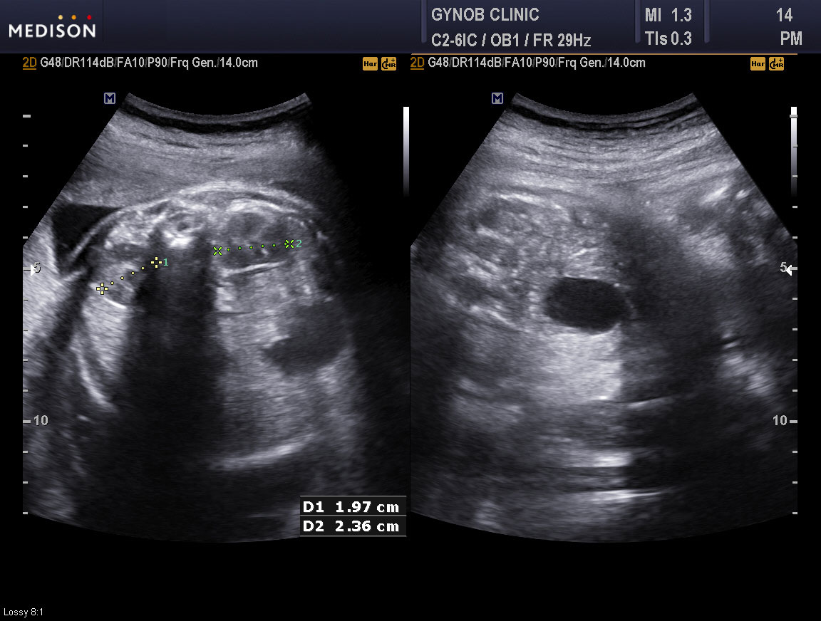 아래는 성균관 의대 (삼성 서울 병원 산부인과) 김문경 교수등이 2009년 대한산부인과 초음파 학회지에 발표한 관련 논문의 내용을 발췌한 것이니 참고하시기 바라며 사진은 저희 병원에서 찍은 초음파 사진으로 좌측은 정상 콩팥의 초음파 소견이고 우측의 까만 동그라미가 방광입니다.