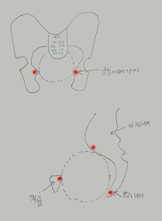 위 그림은 골반의 정면 사진(위)과 측면 사진(아래)으로 빨갛게 점으로 표시한 부분이 골반 중 가장 좁은 부분을 의미하여 대체로 골반이 좁은지 어떤지 하는 것은 정면에서 보았을 때 궁둥이 가시뼈가 내진 시에 도드라지게 만져지는가 아닌가 하는 것으로 판단합니다.