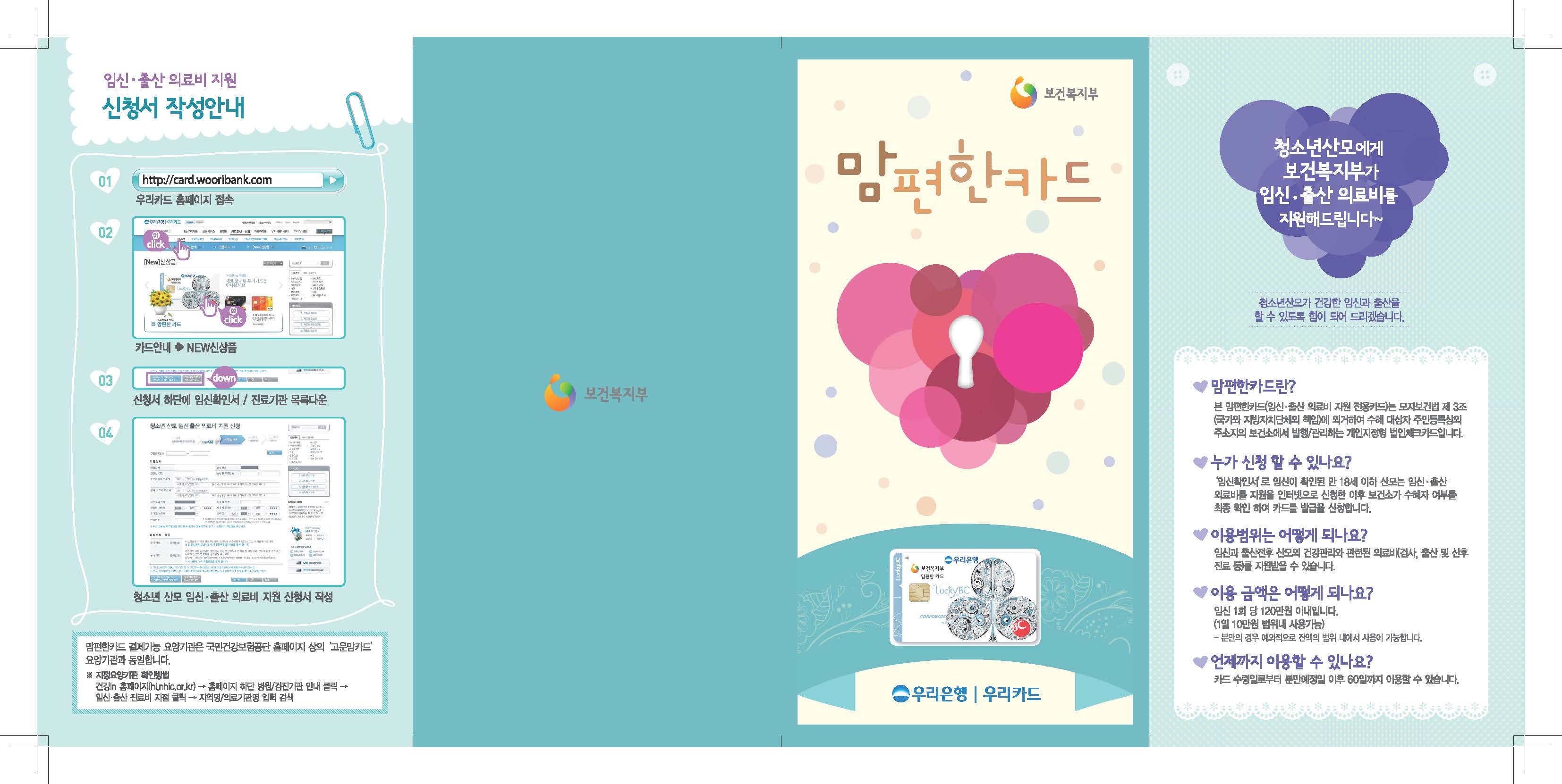 신청방법 우리카드 홈페이지 (card.wooribank.com) 내 청소년산모 , 임신 출산 의료비 지원 인터넷 신청 보건복지 콜 센터 129 우리은행 맘편한카드 담당자 02-2002-3313 |