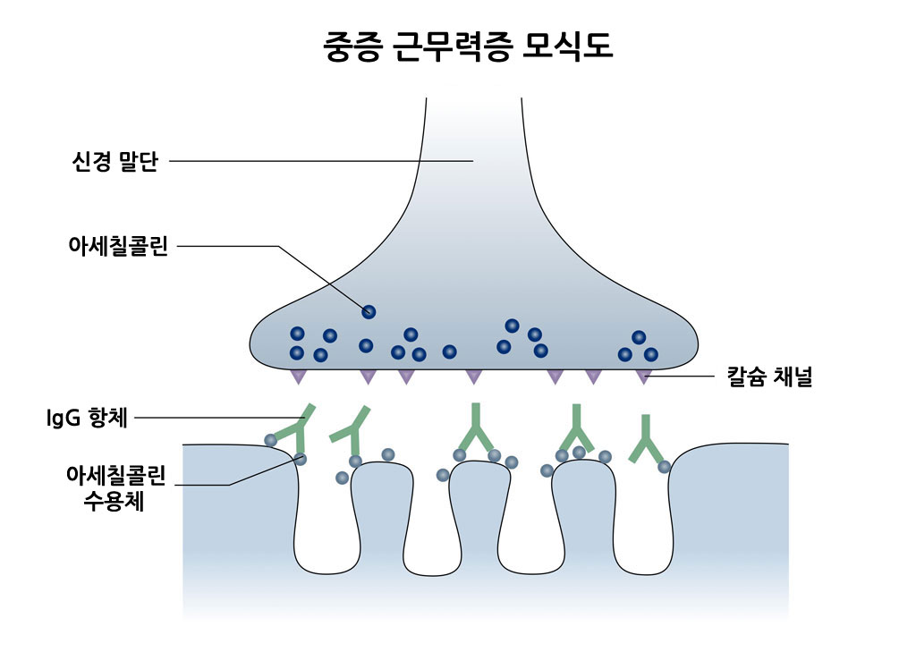병리학적 측면에서 보면 이 병은 시냅스 후 횡문근의 아세틸콜린 수용체가 IgG에 의해 파괴되는 것인데 적절한 수용체가 없으면 아세틸콜린은 근육 활동을 촉발하지 못하여 근육의 수축력 약화를 가져오게 됩니다.