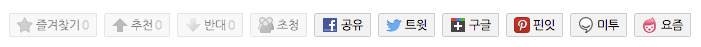 이 버튼은 게시판 글을 다른 사람들과 소통하도록 돕는 메뉴들입니다. 즐겨찾기와 추천, 반대, 초청은 홈페이지 자체 내의 저장이나 추천 버튼이고 그외 나머지 공유, 트윗, 구글, 핀잇, 미투, 요즘은 외부 소셜 미디어 서비스에 글을 공유하는 버튼입니다. 간단히 맨 좌측의 버튼부터 우측으로 돌아가면서 소개해 드리겠습니다.