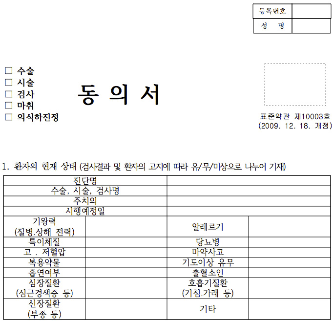 여하튼 아래 첨부 파일로 올려둔 hwp 파일은 여러 의료 행위에 대하여 표준으로 정해진 동의서 양식이고 그 아래 이미지는 올려둔 동의서 파일의 일부 캡쳐 이미지 모습입니다.