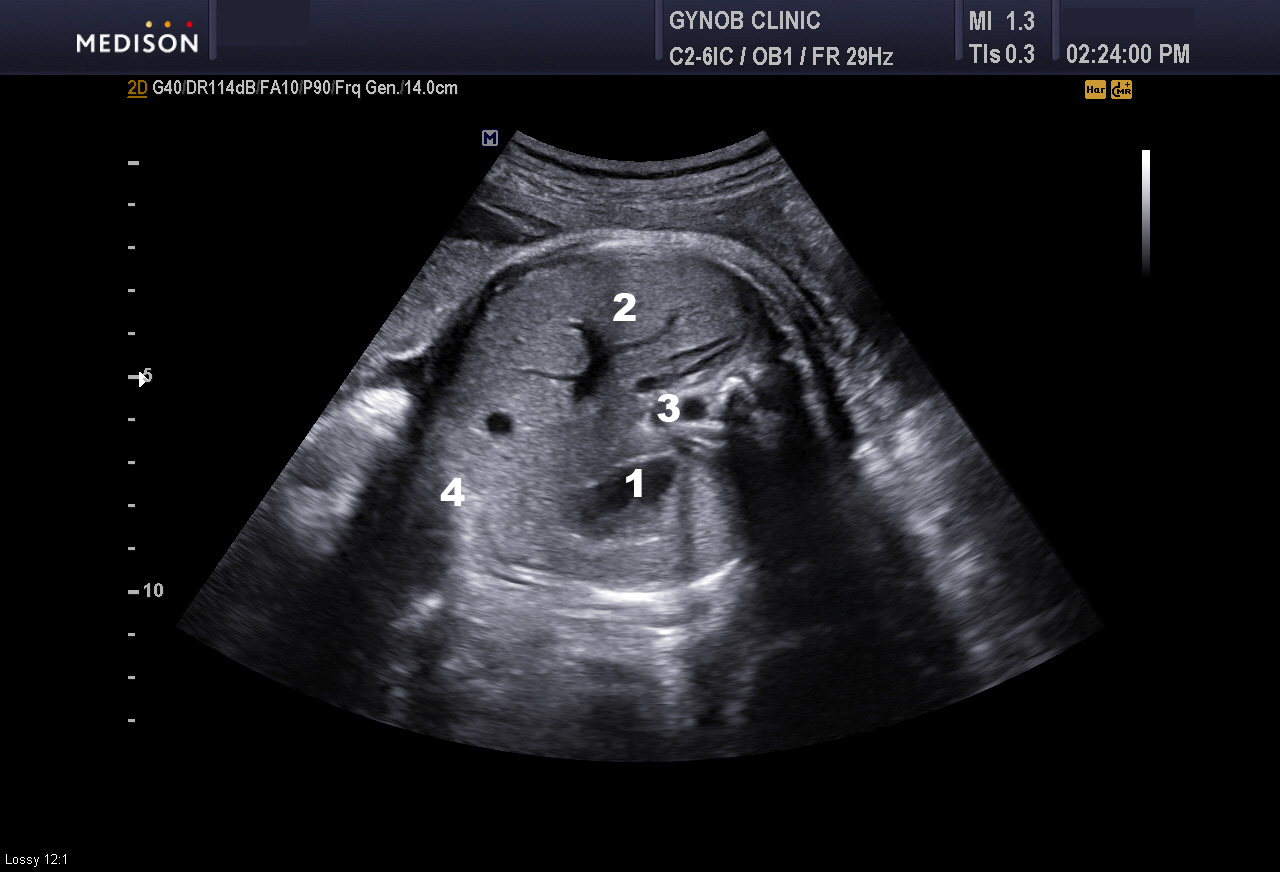 참고로 위의 사진은 저희 병원에서 찍은 사진으로 정상 복부 초음파의 소견입니다. 태아는 성인과 다르게 복부가 타원형이기보다 양수에 떠 있고 한 이유 등으로 거의 동그란 원형에 가깝습니다. 사진에 나타낸 숫자는 아래의 장기에 해당합니다. 1번: 위장 2번: 간 3번: 대동맥 4번: 복벽 |