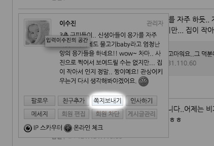 3. 쪽지 보내기쪽지 보내기는 비단 진오비 산부인과 원장이나 진오비 산부인과 직원이 아니라도 이곳에 회원으로 가입한 분 누구에게나 보낼 수 있는 기능입니다. 토막글에서 보이는 아바타에 마우스 버튼을 가져다 대었을 때 나타나는 팝업 창에서 [쪽지 보내기]를 클릭하셔서 글을 쓰시면 해당 회원에게 쪽지 알림이 가게 되어 있습니다. 그외에도 해당 회원이 쓴 게시판 글을 열면 우측 상단의 아바타 밑에 [쪽지 보내기] 아이콘이 나타나므로 그 부분을 클릭해서 쪽지를 보내도 됩니다. 물론 이 쪽지도 다른 사람에게는 내용이 보이지 않습니다.