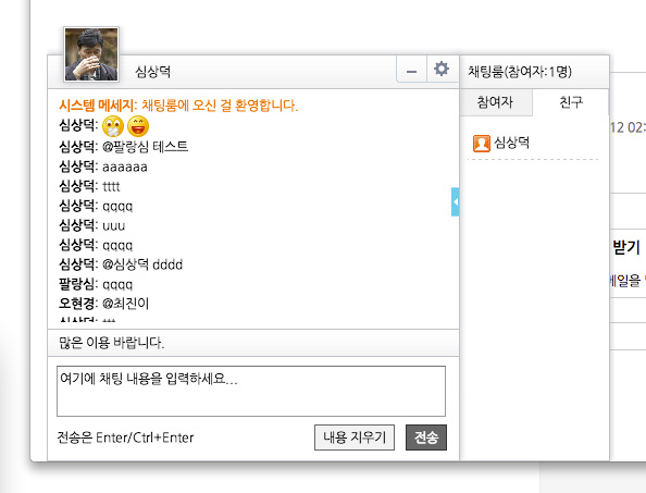 글삭제 버튼 관련: 글삭제 버튼을 누르면 자신이 쓴 마지막 대화방 글이 삭제됩니다. 자신이 쓴 특정글을 삭제하려면 글의 고유 번호를 대화창에 넣고 글삭제 버튼을 누르면 됩니다. 글의 고유번호는 해당 글의 앞에 있는 자신의 아이디 부분에 마우스를 올리고 있으면 풍선 도움말로 글의 번호가 뜹니다. 그 번호를 넣으시면 됩니다. 글을 여러개 지울 때는 번호를 콤마로 구분해서 쓰고 글삭제 버튼을 누르면 됩니다. 회원들은 자신의 글만 삭제할 수 있으며 관리자는 모든 회원의 글을 삭제할 수도 있습니다. 특별한 비방글이나 문제가 되는 글이 아니면 삭제하지는 않습니다. |