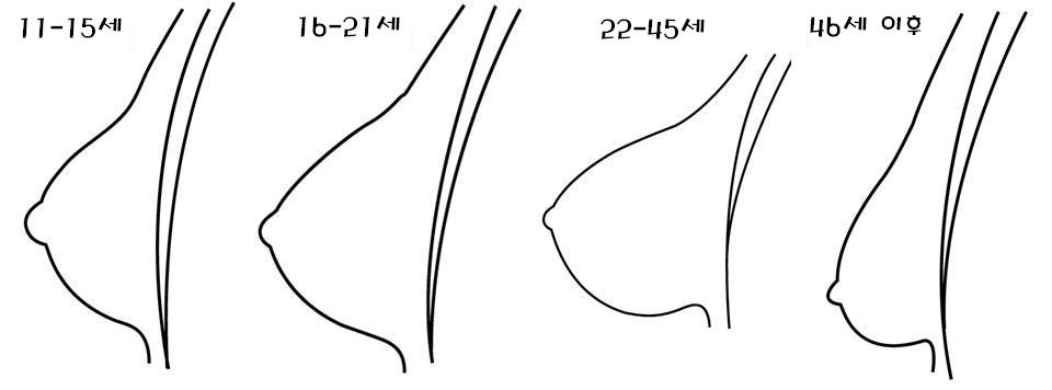 폐경기에 가까이 오면 여성호르몬의 분비가 불규칙 해지다 더 이상 분비되지 않고 배란이 일어나지 않게 됩니다. 그로 인해 지금까지 여성 호르몬인 에스트로겐의 영향을 받아온 유방 내의 유선과 피하지방은 위축되게 됩니다 . 또 나이가 듦에 따라 연부조직의 탄성이 떨어져서 유방의 모양을 지탱하는 인대의 탄성 역시 떨어져서 유방의 모양도 변하게 됩니다 .